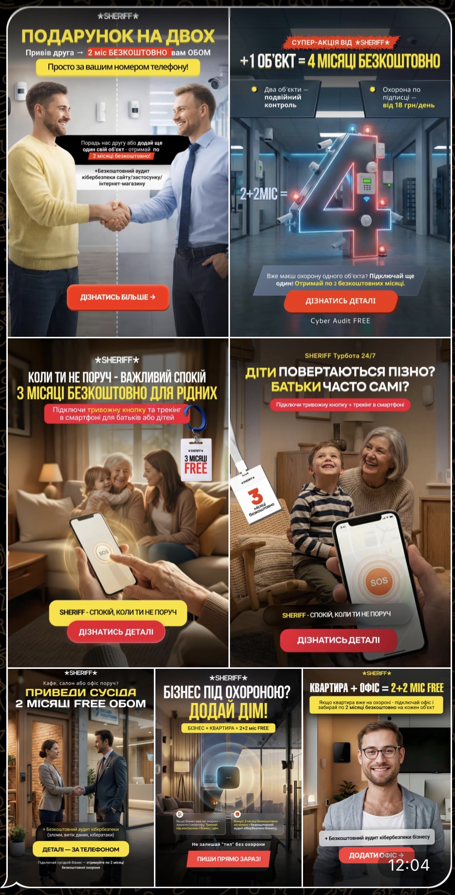AI-креативи від JemAds AI advertising для охоронного холдингу Sheriff, створені для посилення digital-присутності, підвищення довіри та генерації заявок через AI Production преміум рівня.