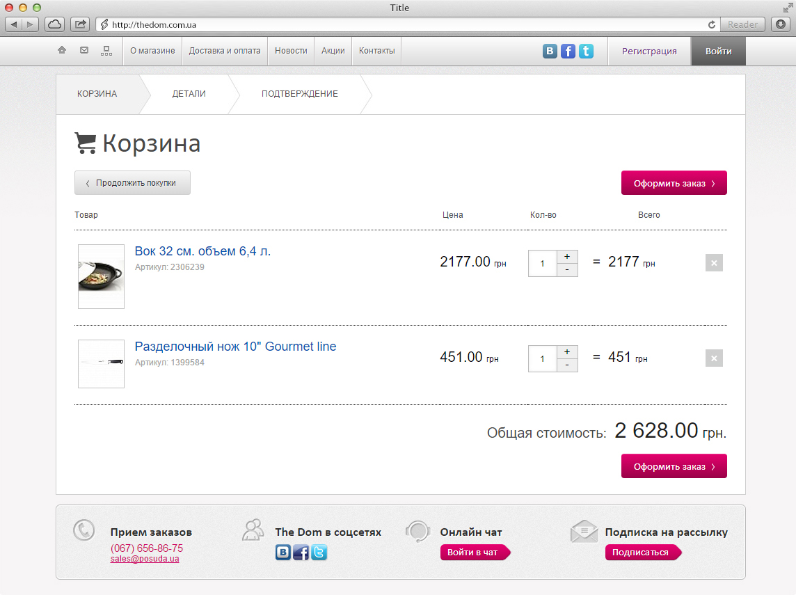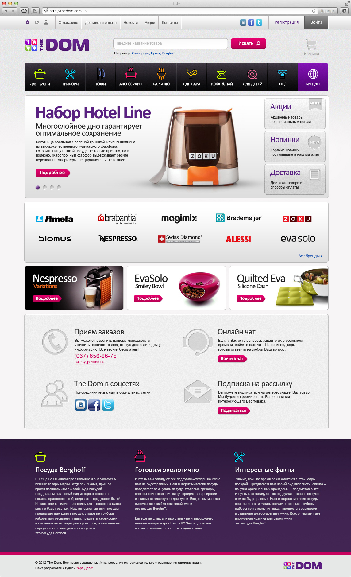 The site features a brand catalog, a streamlined registration process, and a user account section with profile management and order history. An integrated live chat supports direct communication, while an email subscription form keeps users informed about offers and updates.